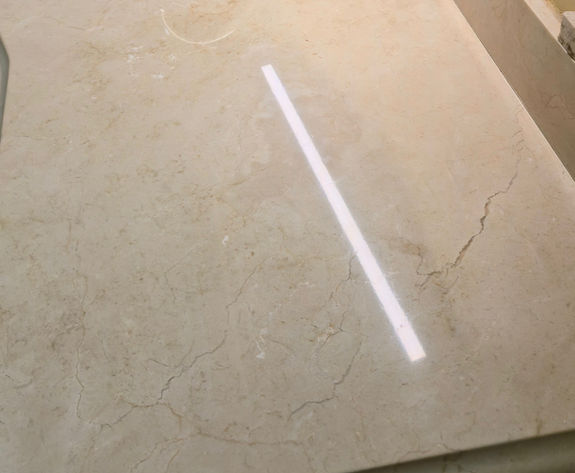 "In this project, the restoration and polishing service for this marble countertop began with a meticulous protection phase of the surroundings using plastic sheeting and tape, followed by a deep cleaning to remove embedded impurities. Subsequently, a mechanical abrasion process was performed using diamond pads of varying grits to level the surface and eliminate scratches or acid etch marks, culminating in the application of professional sealers that penetrate the stone’s porosity to protect it against future grease or liquid spills. The final result, clearly visible in the second image, is a high-definition "mirror finish" that not only highlights the natural beauty and veining of the material but also ensures a completely hygienic, smooth, and renewed surface for daily kitchen use